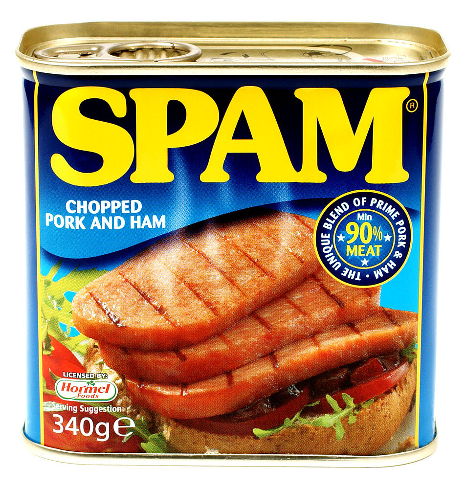 Im 2. Weltkrieg war „Spam“ in Großbritanien ein Markenname für billiges Pressfleisch in Dosen (SPAM = „SPiced hAM“ oder „Specially Prepared Assorted Meat“) und eines der wenigen Nahrungsmittel, welches man noch ohne Lebensmittelkarten kaufen konnte. Als Synonym für eine unnötig häufige Verwendung und Wiederholung wurde der Begriff durch einen Sketch der englischen Comedy-Serie Monty „Python’s Flying Circus“ geprägt: In dem in einem Café die Speisekarte nur Gerichte mit Spam anbot.