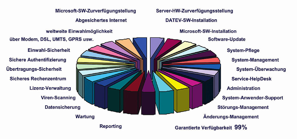 Die Überlegung: Aufgrund der Windows-basierten Programmstruktur der DATEV-Anwendungen brauchte man bei einer RZ-basierten ASP-Lösung weiterhin File-, Kommunikations- und WTS-Server – wie bei einer Vor-Ort-Lösung. Man braucht auch eine DATEV-DFÜ (damals noch eine ISDN-Karte, die für den RZ-Betrieb eigentlich nicht brauchbar war), man brauchte hier und da Windows- und MS-Office-Lizenzen, in beiden Fällen brauchte man die nutzerabhängigen Überlassungsvergütungen für die DATEV-Anwendersoftware. Man brauchte hier und dort eine Datensicherungstechnik und IT-Spezialisten, die per Fernwartung die Server administrieren, denn auch beim RZ-ASP-Betrieb sitzt ja kein ITler direkt vor den Servern im RZ. Man hat in beiden Fällen Service-Management-Tools zur Serverüberwachung und eine automatische Störungsmeldung. Man brauchte hier wie da eine Anwender-Hotline, einen Helpdesk, einen Programm-Update-Service. Und man braucht auch in beiden Lösungen immer teurer werdenden Strom für das IT-Equipment.